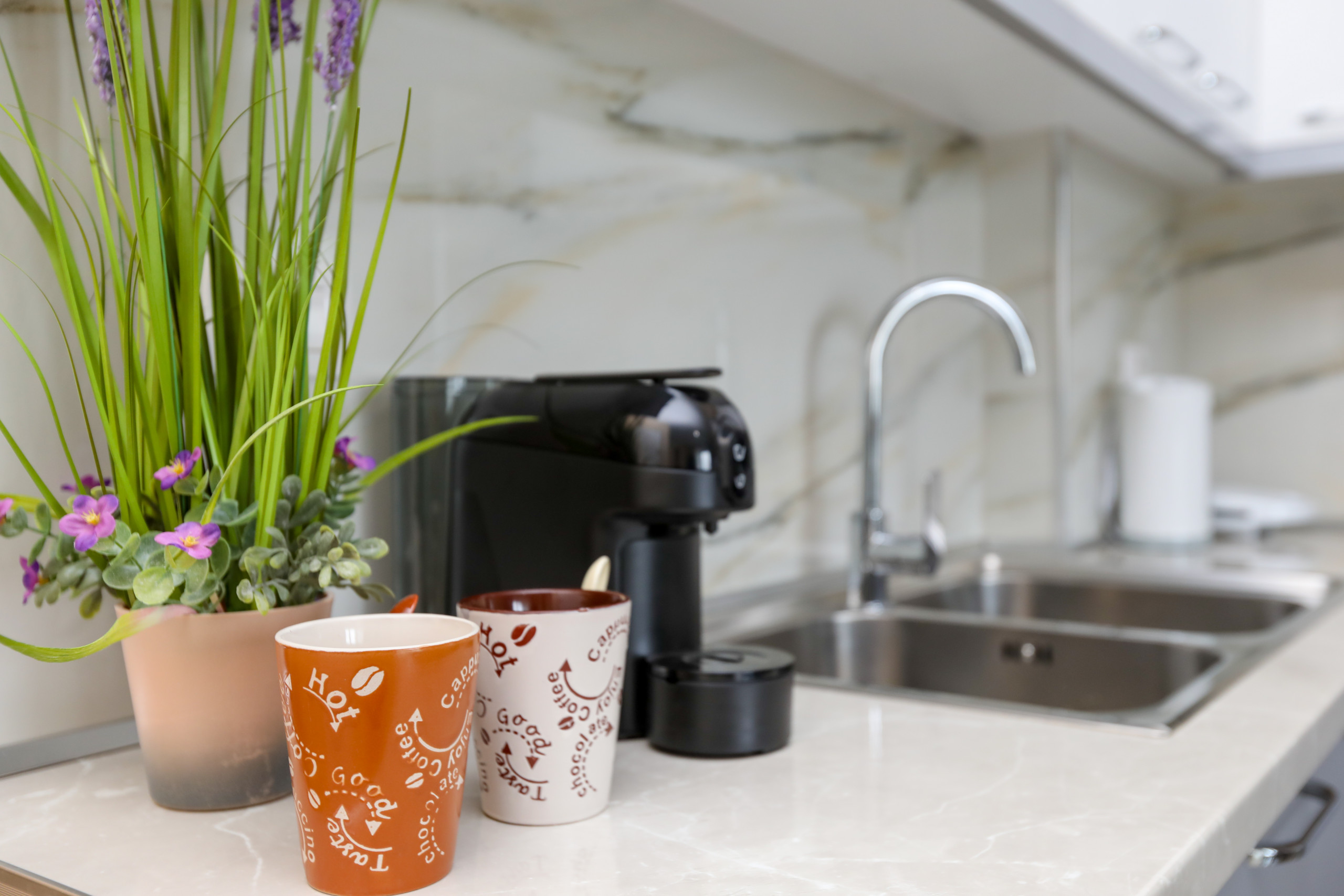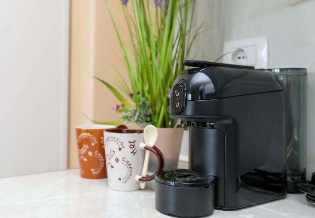 The apartment boasts a fully equipped kitchen with essential appliances including a fridge, freezer, coffee machine, toaster, kettle, and kitchenware, allowing guests to prepare meals and enjoy home-like convenience. A washing machine adds practicality for longer stays.