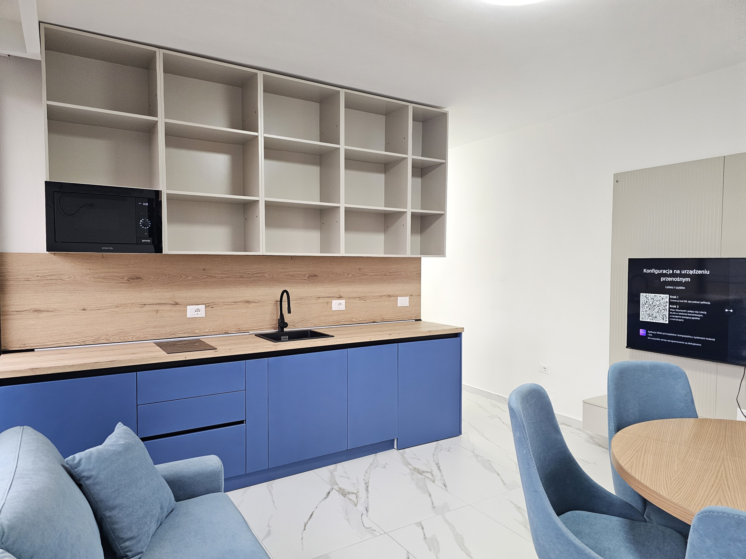 The apartment features a well-designed 1-bedroom layout accommodating up to 4 guests, with a comfortable double bed and a convenient double sofa bed. The single bathroom includes a modern shower, ensuring comfort and convenience for all guests. The spacious 61 square metre property boasts a thoughtfully equipped American-style kitchen with top-quality appliances, including an induction cooktop, fridge, freezer, dishwasher, microwave, coffee machine, and essential small appliances like a toaster and kettle.