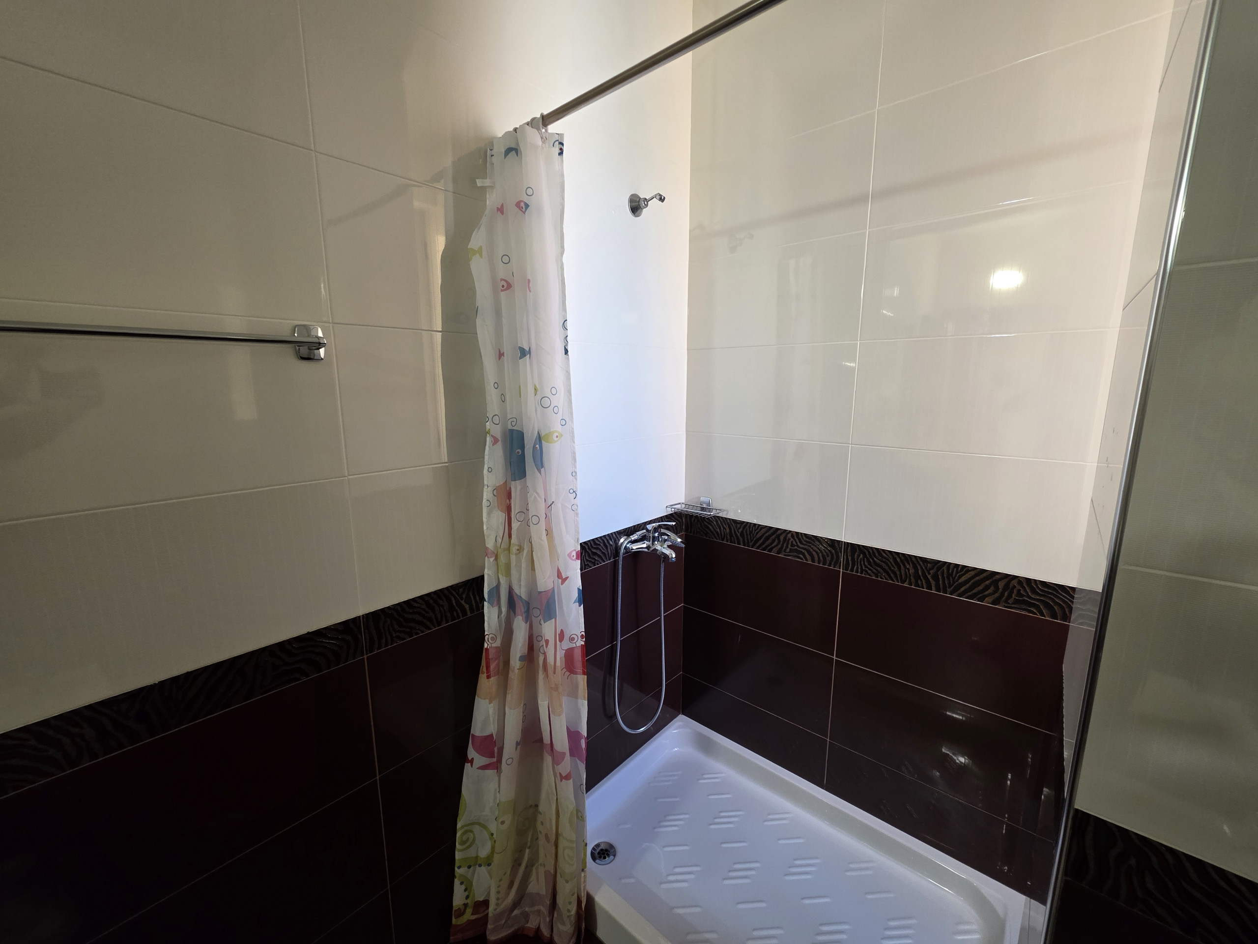 The apartment offers two well-appointed bedrooms with a flexible sleeping arrangement, featuring one queen-size bed, two individual beds, and a comfortable sofa bed, accommodating up to 5 guests comfortably. Two contemporary bathrooms with shower facilities ensure convenience and privacy for all occupants.